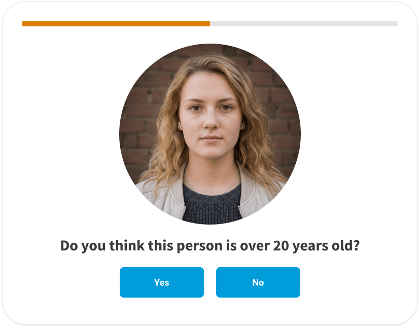 Each session draws from a curated photo database of faces — men and women across a range of ages deliberately chosen around the age limit boundary.