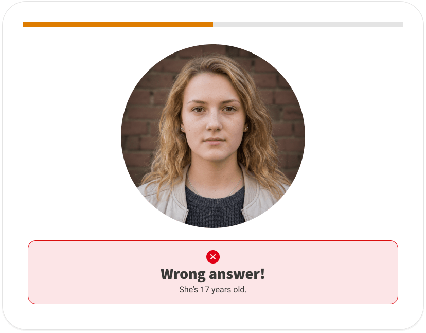 After each guess, the person's real age is revealed. Correct answers are confirmed. Wrong answers create the learning moment.