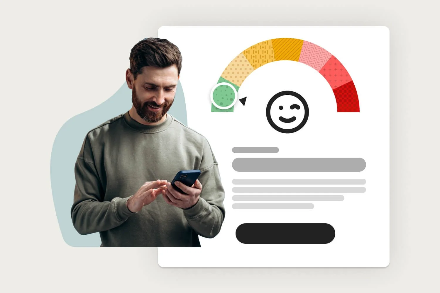 The smiley and risk meter are design elements familiar to most players, enabling them to instantly and intuitively understand their level of risk. A brief text explains the risk scoring and leads to the recommended action, which varies depending on the score.