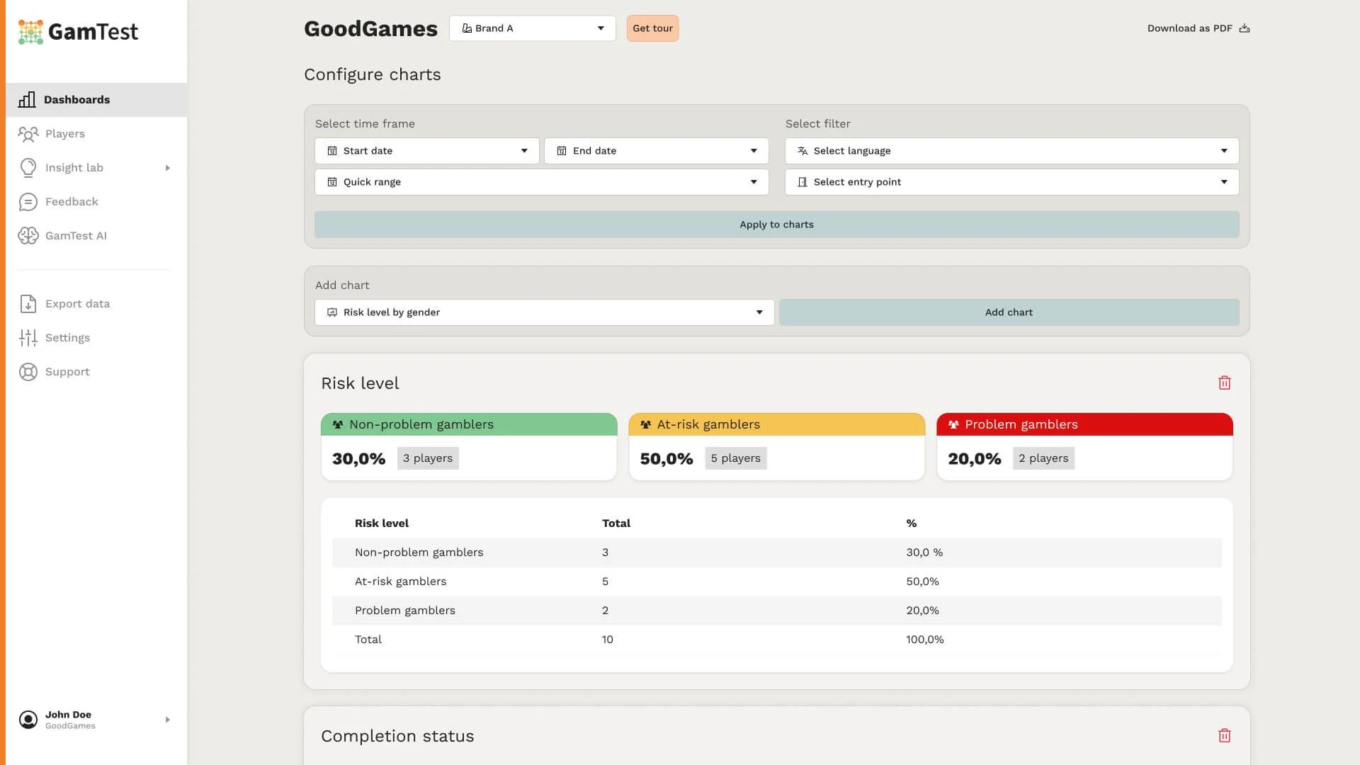 Looking for an easy-to-use tool for reliable insights into the well-being of your overall player population? Then GamTest might be the right choice for you. With its robust back-office tool, you can effortlessly analyse statistics and compile the reports you need.